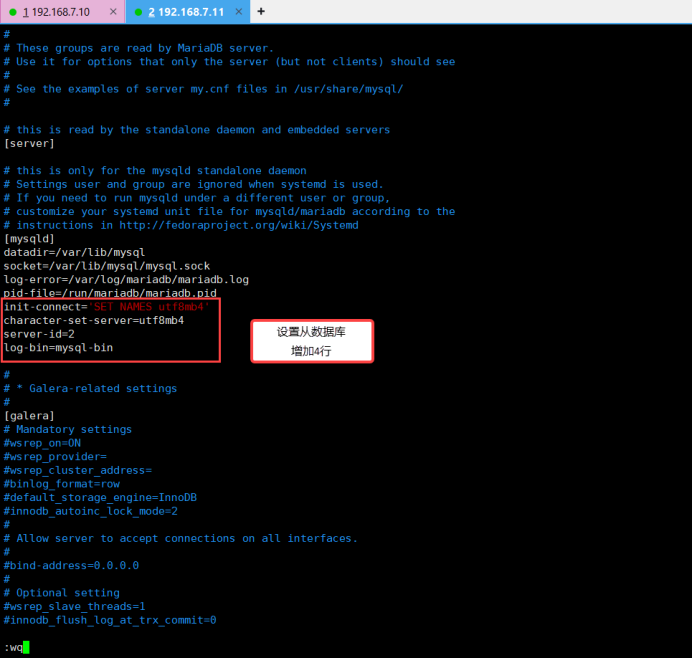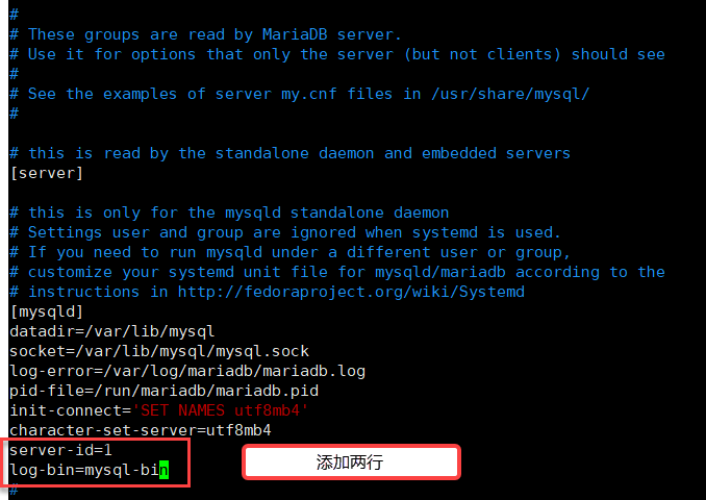 [root@db2 ~]# vim /etc/my.cnf.d/mariadb-server.cnf 编辑数据库的主配置文件