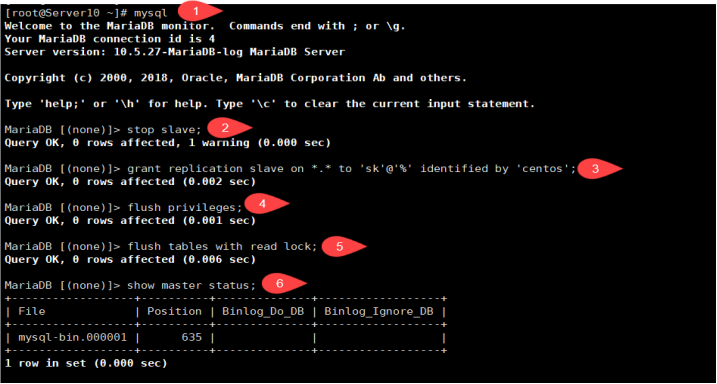 MariaDB [(none)]> grant replication slave on *.* to 'sk'@'%' identified by 'centos'; 将数据库的所有内容全部授权给从数据库 复制授权的内容为sk 允许从任何IP访问,认证的密码为centos,