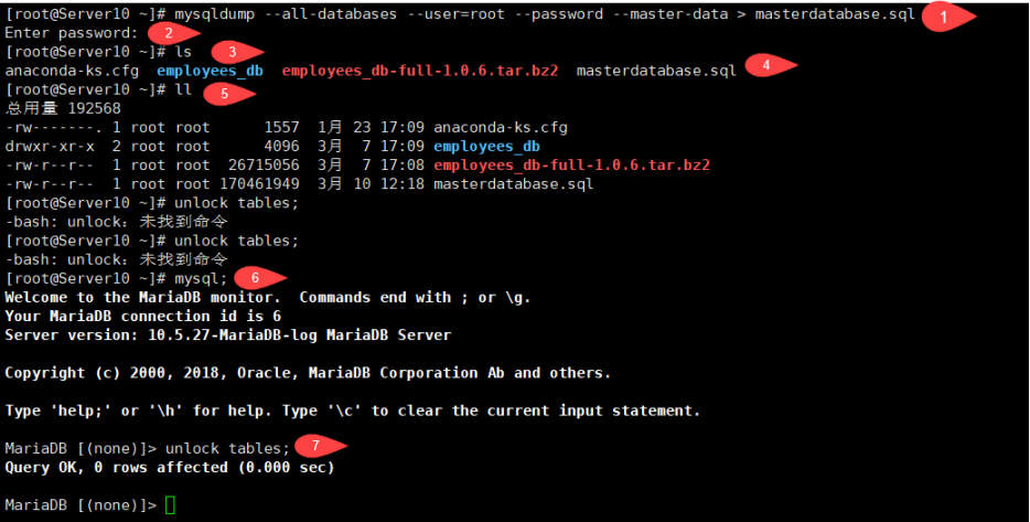 [root@server10 ~]# mysqldump --all-databases --user=root --password --master-data > masterdatabase.sql 将所有数据库全部备份出来 备份的名称masterdatabase.sql --user=root数据库的用户 --password数据库的密码 --master-data指向主数据