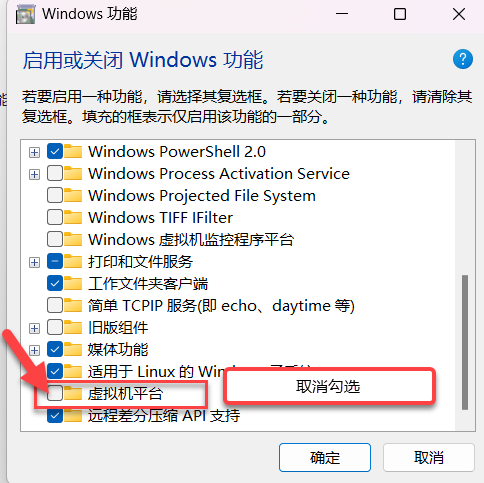 要是虚拟化Intel VT-x/EPT勾选不了,需要打开本地电脑的windows功能,取消掉勾选虚拟机平台,后重启电脑生效。