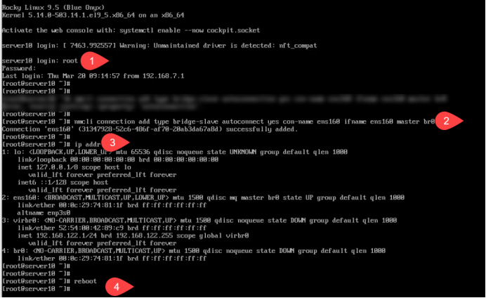 [root@server10 ~]# nmcli connection add type bridge autoconnect yes con-name br0 ifname br0 网络连接添加类型为桥接网卡,设置为自动连接