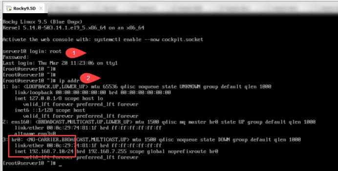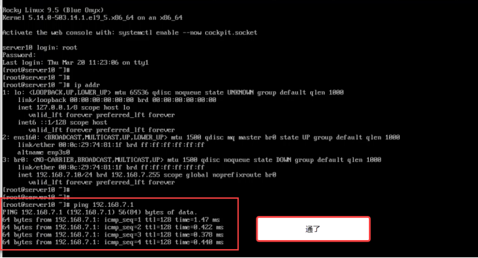 [root@server10 ~]# nmcli connection modify br0 ipv4.addresses 192.168.7.10/24 ipv4.method manual 网络连接手动修改br0 网卡的ipv4的IP地址为:192.168.7.10,子网掩码是24