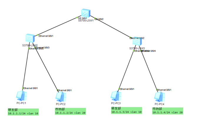 [2SW1-Ethernet0/0/1]port trunk allow-pass vlan 10 20 端口中继链路允许vlan10、20通过