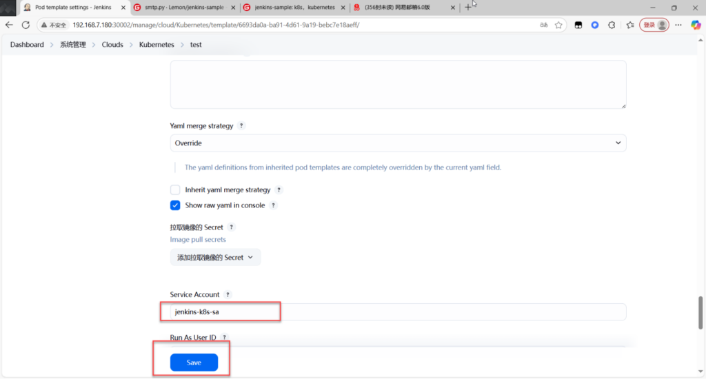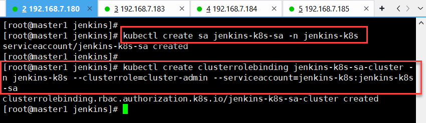 [root@master1 jenkins~]# kubectl create sa jenkins-k8s-sa -n jenkins-k8s(在命名空间下创建sa账号,名称为jenkins-k8s)