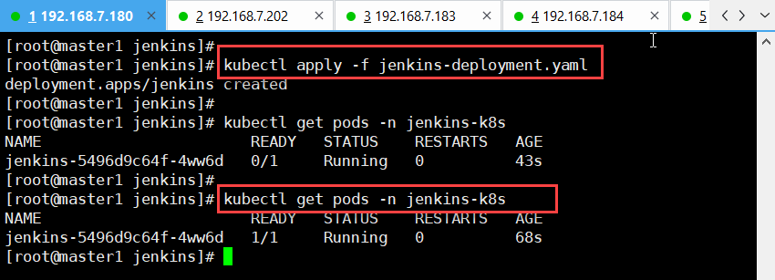 [root@master1 jenkins]# kubectl apply -f jenkins-deployment.yaml (应用Jenkins无状服务配置文件)