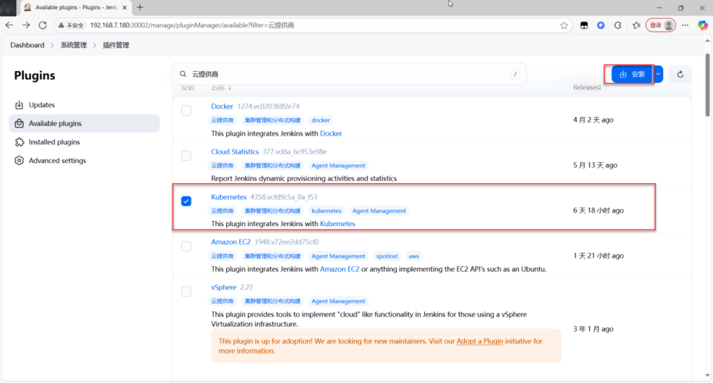 master1 jenkins上 安装docker插件、安装docker阿里云数据源、安装docker