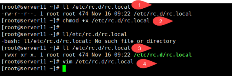 [root@server10 ~]# ll /etc/rc.d/rc.local 查看开启启动配置文件权限