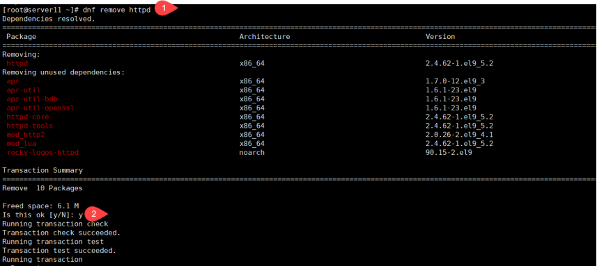 [root@server10 ~]# dnf -y remove httpd dnf卸载阿帕奇