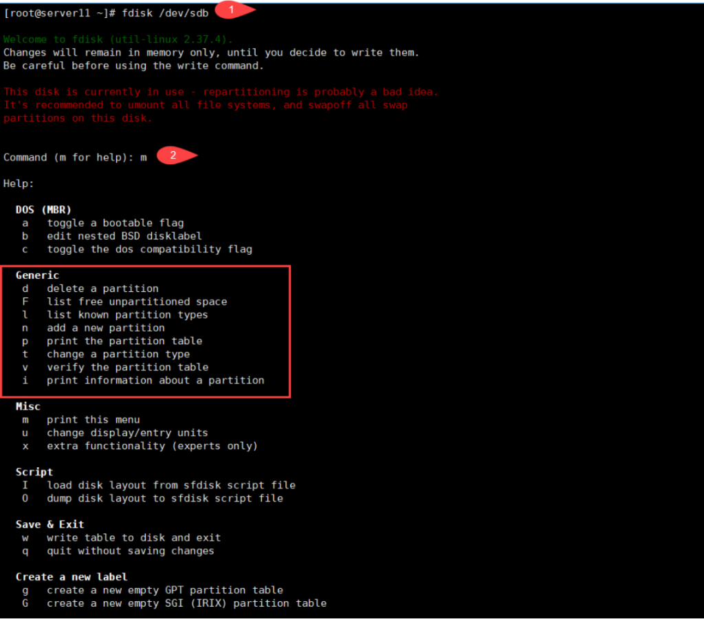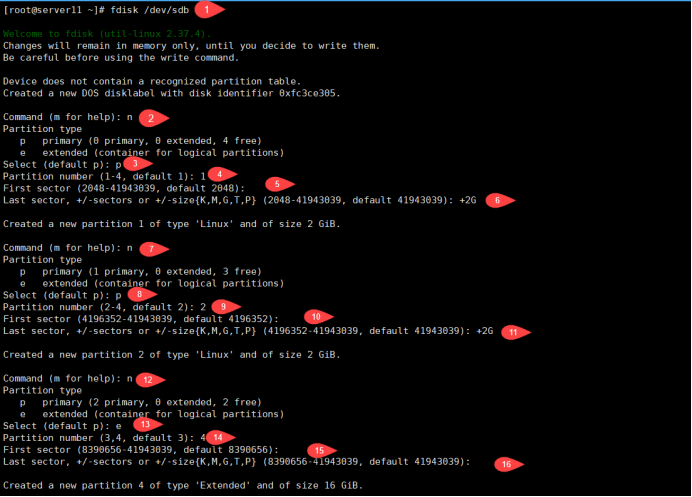 [root@server10 ~]# fdisk /dev/sdb 对sdb磁盘进行分区