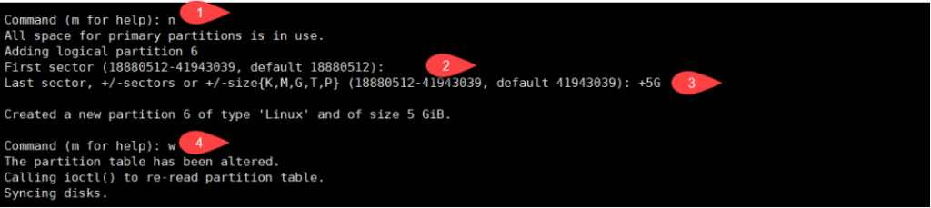 Created a new partition 6 of type ‘Linux’ and of size 5 GiB.