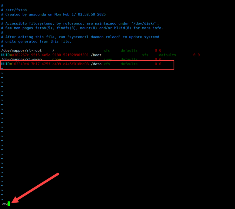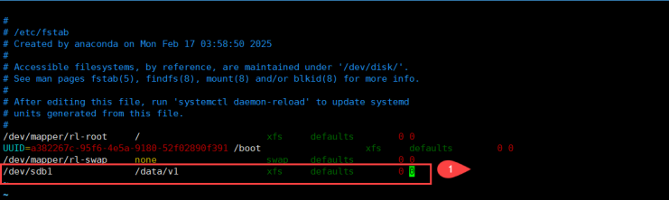 UUID=017c9262-4ed0-4ed3-9de4-463ae2263d09 /data xfs sdb1磁盘的UUID挂载到data目录下 文件系统xfs defaults 默认参数 0 不备份0不检查磁盘