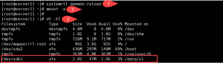 /dev/sdb1 xfs 2.0G 47M 1.9G 3% /data/v1