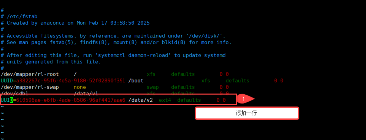 UUID=0959e8ed-cd9e-4993-8878-0175b027b673 表示sdb2的磁盘UUID号 /data/v2 挂载到V2目录下 ext4文件系统为扩展文件系统,4表示第四代 defaults 默认参数 0 不备份0不检查磁盘