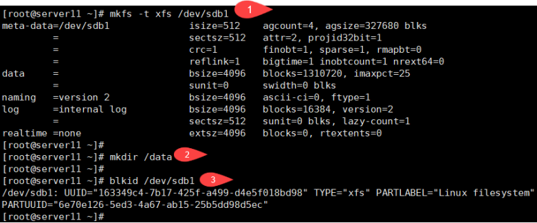 [root@server10 ~]# mkfs -t xfs /dev/sdb1 使用xfs格式化sdb1的磁盘