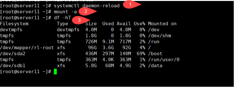 /dev/sdb1 xfs 5.0G 68M 4.9G 2% /data